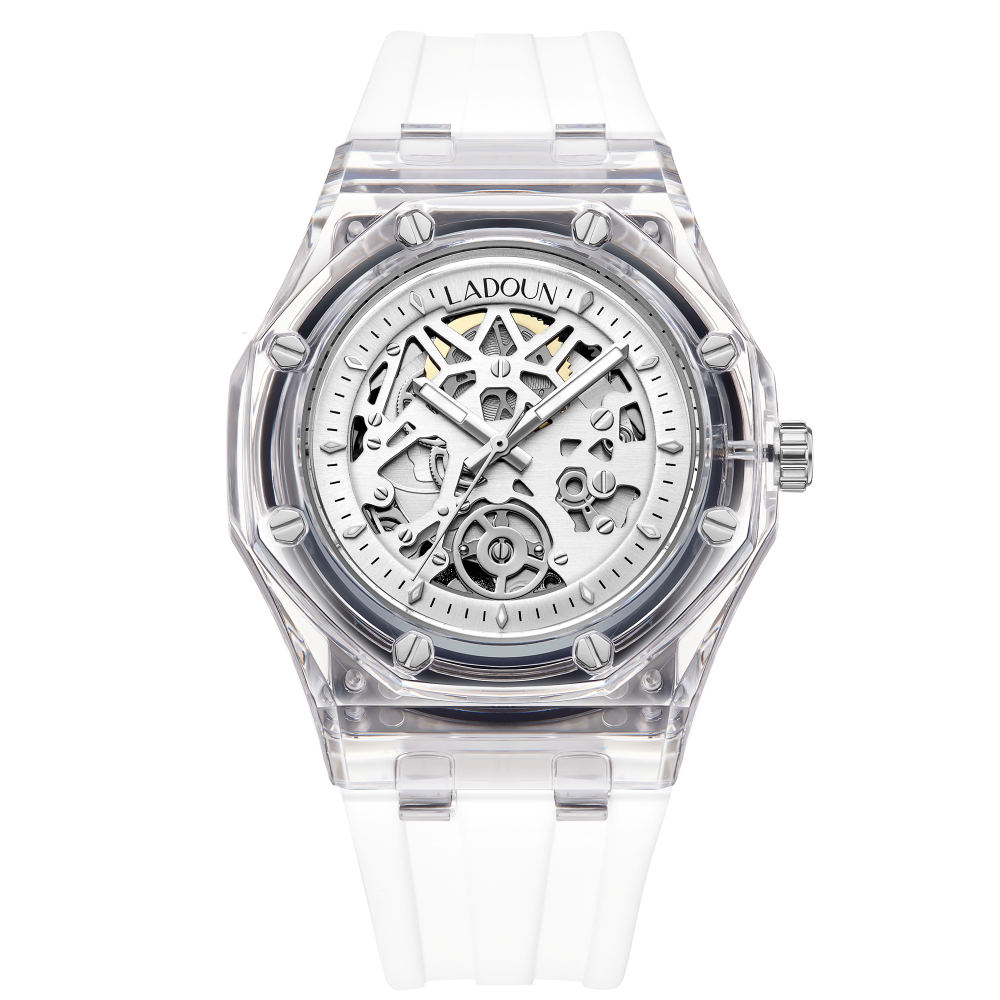 إذا كنت تميل إلى التصاميم الجريئة والمختلفة، فإن ساعة لادون الشفافة تمنحك إطلالة عصرية لافتة للنظر.