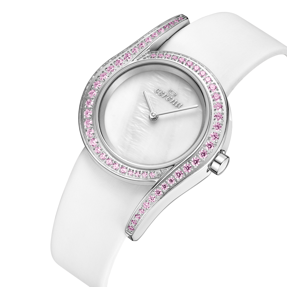 - تصميم أنثوي راقي يتمثل في سير جلد أبيض كلاسيكي مع تفاصيل أنيقة تضيف لمسة من التألق.