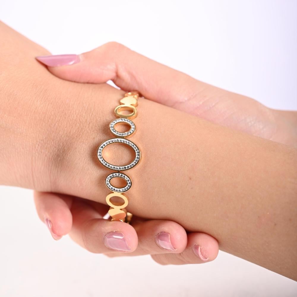 أضيفي لمسة من الرقي إلى إطلالتك مع هذه الإسورة الأنيقة المصنوعة من أستيل لامع عالي الجودة. تتميز بتصميم ناعم مرصع بفصوص براقة تمنحها مظهرًا فاخرًا يلفت الأنظار.