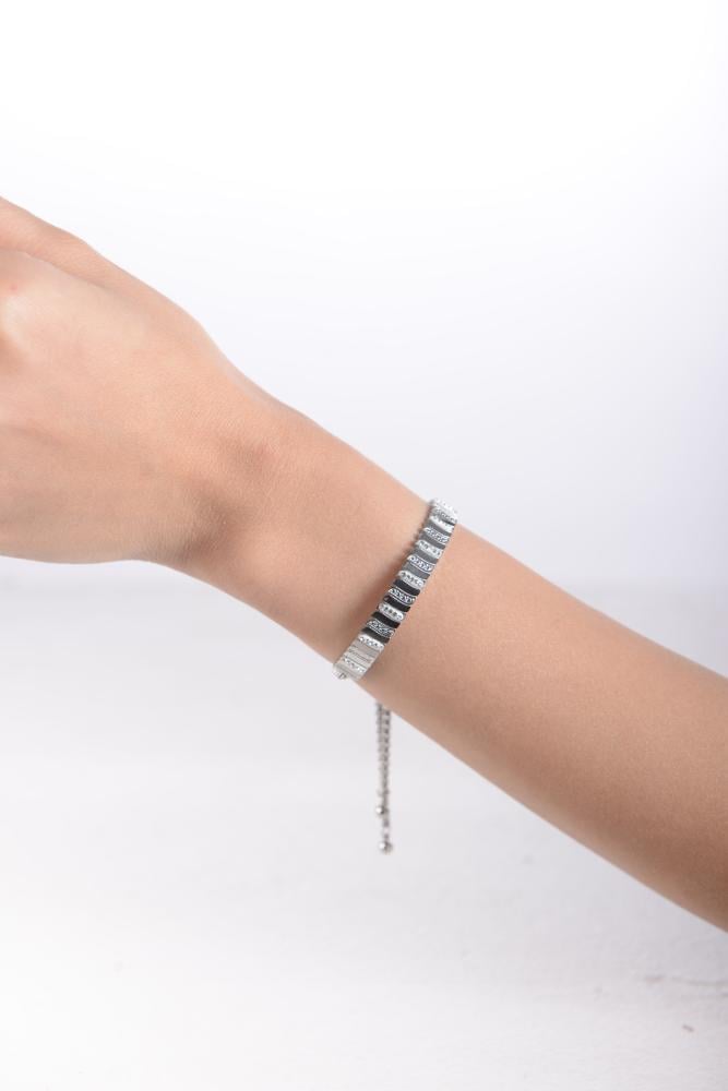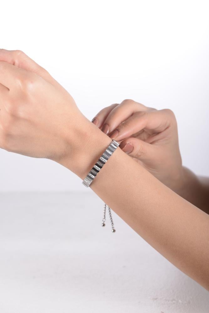 أضيفي لمسة من الرقي إلى إطلالتك مع هذه الإسورة الأنيقة المصنوعة من أستيل لامع عالي الجودة. تتميز بتصميم ناعم مرصع بفصوص براقة تمنحها مظهرًا فاخرًا يلفت الأنظار.