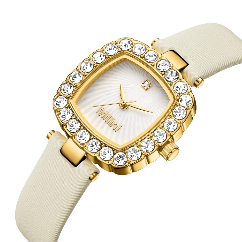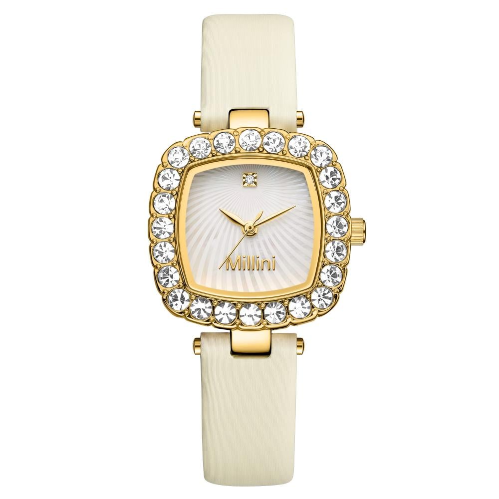 ساعة ذهبية نسائية ماركة Millini بتصميم مربع وسير أبيض فاخر تضفي لمسة من الأناقة. تتميز هذه الساعة بتفاصيل دقيقة تجمع بين الفخامة والنعومة، مما يجعلها الخيار المثالي لكل سيدة تبحث عن التميز.