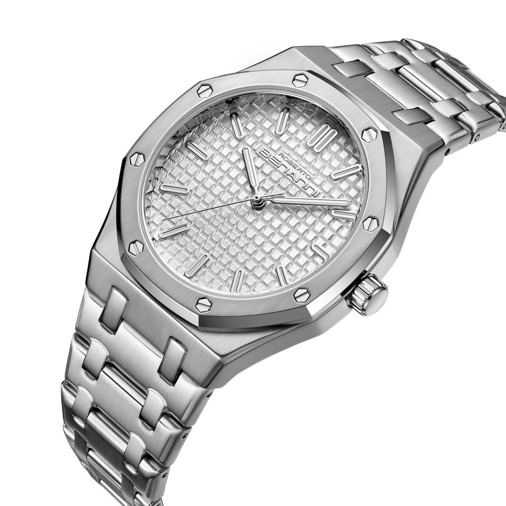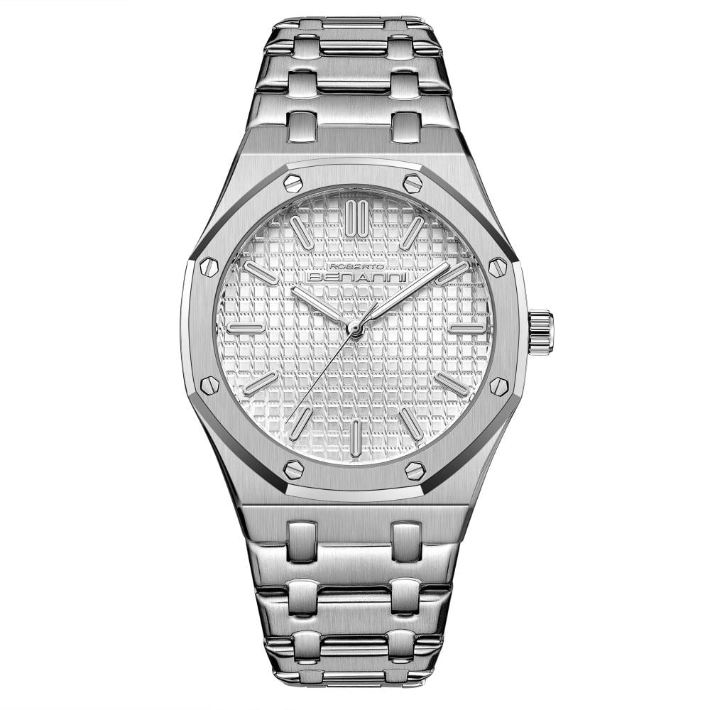 تأتي هذه الساعة الرجالية بتصميم دائري مميز، يحيط به إطار مثمّن الشكل مزود بمسامير ظاهرة تضيف لمسة صناعية راقية. الميناء الفضي يتميز بنقشة ناعمة ومؤشرات مستطيلة واضحة بدون أرقام أو فصوص، مما يمنح الساعة مظهرًا عمليًا واحترافيًا. السوار المعدني الفضي بالكامل مصنوع من الستيل المقاوم للصدأ، ليمنحك متانة وأناقة تدوم. إنها ساعة فاخرة من Reberto Benanni، ، وتُعد خيارًا مثاليًا لهدايا الرجال الأنيقين.