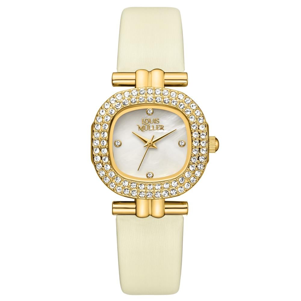 تأتي هذه الساعة بسوار أسود أنيق مصنوع من الجلد الصناعي عالي الجودة، مع إطار ذهبي فاخر مرصع بفصوص الزركون اللامعة التي تضيف بريقًا ملكيًا. الميناء الأبيض يحمل توقيع Louis Muller ويتميز بتفاصيل ذهبية ناعمة، مما يجعلها خيارًا مثاليًا لعاشقات الساعات الفاخرة. إنها ساعة تجمع بين التصميم العصري والفخامة الكلاسيكية، وتناسب جميع المناسبات من الرسمية إلى اليومية.