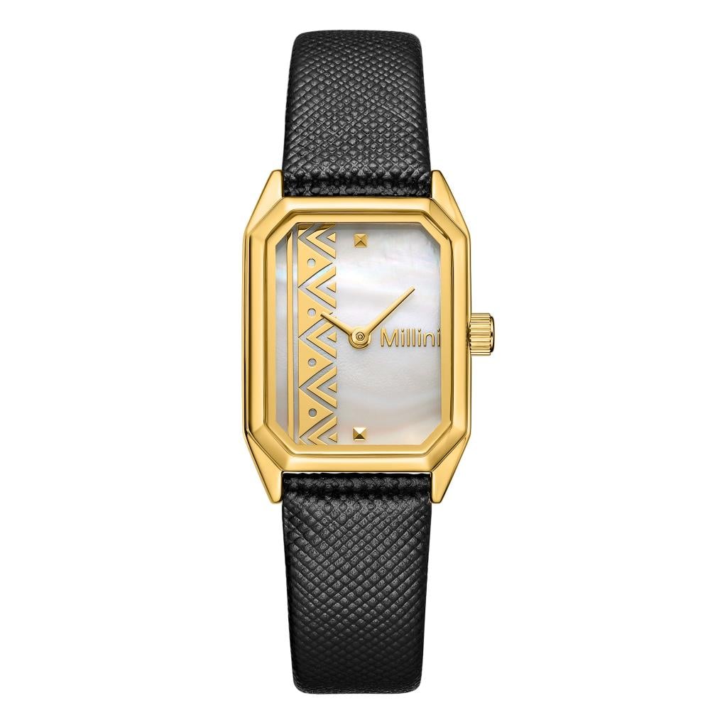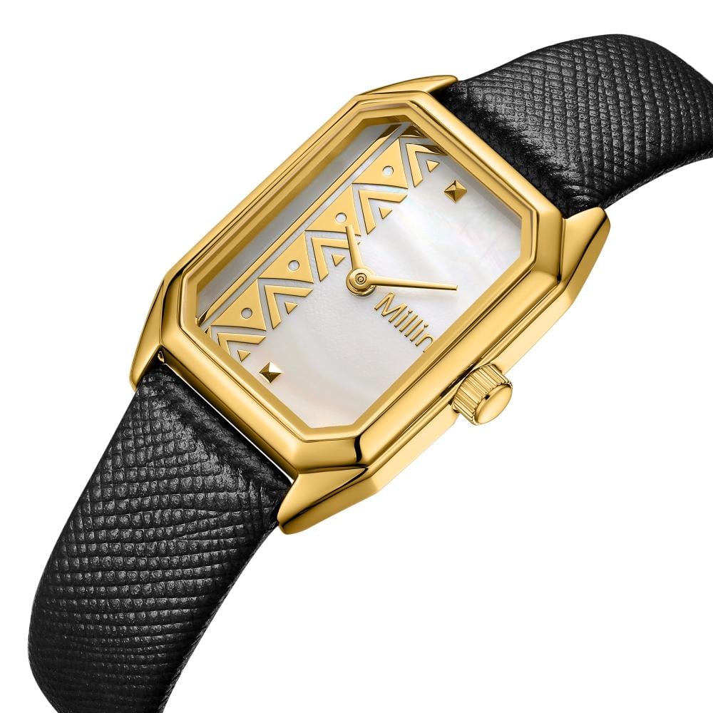 تألقي بإطلالة فريدة مع هذه الساعة النسائية التي تتميز بإطار ذهبي أنيق يحيط بميناء أبيض مزخرف بنقوش هندسية ذهبية على الجانب، مما يمنحها طابعًا فنيًا راقيًا. السوار الأسود المصنوع من خامة ناعمة يضفي لمسة من الراحة والأناقة، بينما العقارب الذهبية تضيف تفاصيل دقيقة تناسب كل لحظة. إنها ساعة مثالية لعاشقات الساعات المستطيلة والساعات الفاخرة ذات الطابع الفني.