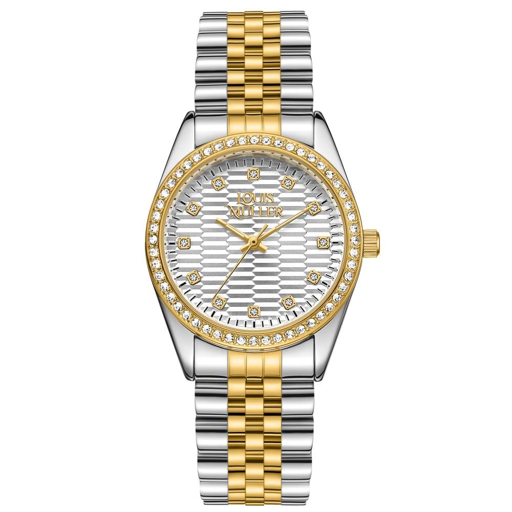 تأتي هذه الساعة بتصميم أنيق يجمع بين اللونين الذهبي والفضي في سوار معدني من الستيل المقاوم للصدأ، مع ميناء فضي مزخرف بخطوط أفقية تضيف لمسة عصرية راقية. تم تزيين مؤشرات الساعة بفصوص زركون وكريستال، ويحيط بها إطار ذهبي مرصع يمنحك بريقًا ملكيًا. إنها ساعة مثالية لعاشقات الأناقة والتميز.