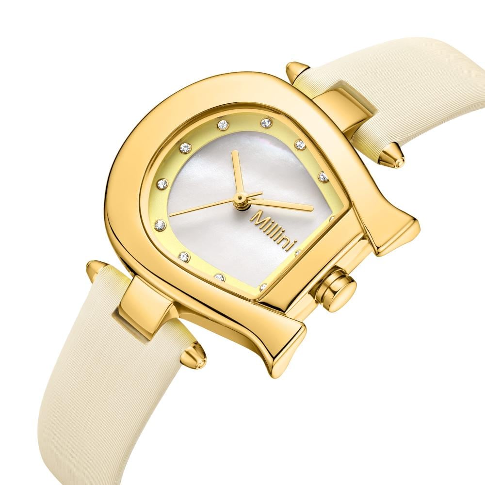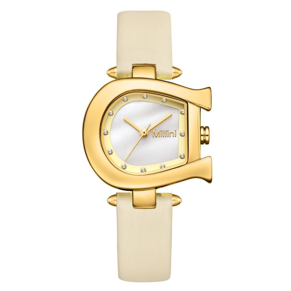 ساعة نسائية فاخرة بتصميم حدوة ذهبية وسير بيج أنيق، تجمع بين الفخامة والنعومة. هذه الساعة ليست مجرد أداة لقياس الوقت، بل هي تعبير عن الأناقة والتميز.