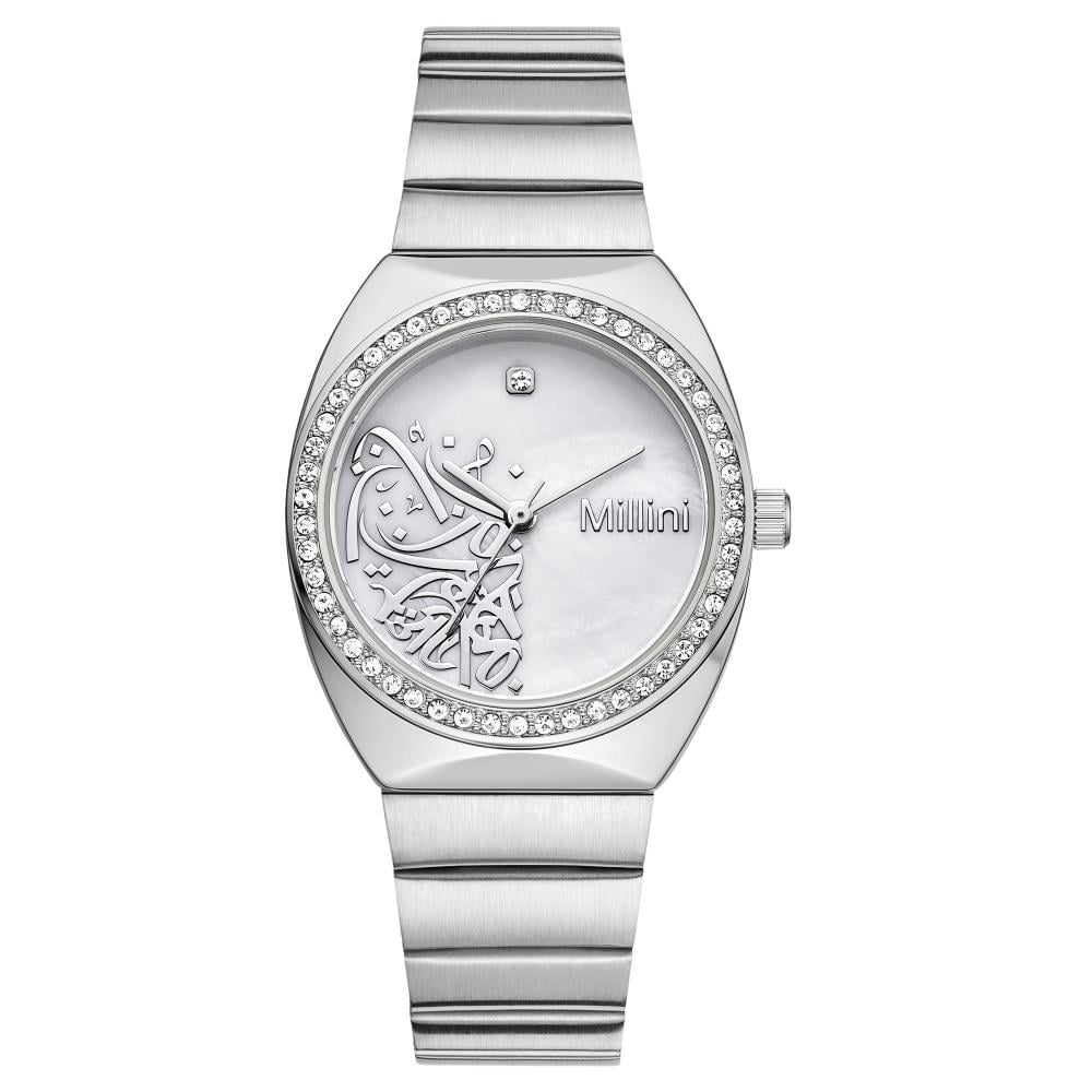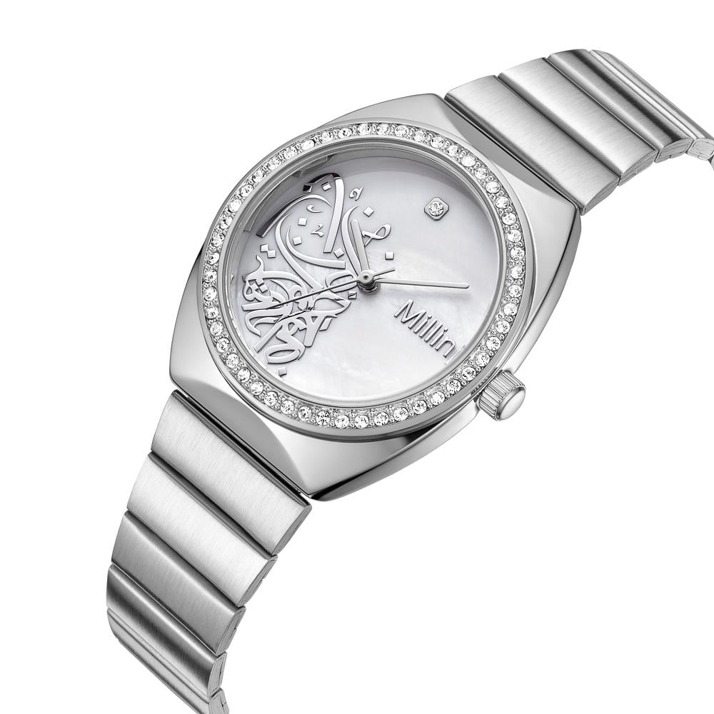 تألقي بإطلالة مميزة مع هذه الساعة التي تجمع بين الفخامة الكلاسيكية والطابع الثقافي الراقي، حيث يتميز الميناء الفضي بنقوش عربية أنيقة تضيف لمسة فنية فريدة، مع حجر زركون صغير عند الساعة 12. يحيط بالميناء إطار مرصع بفصوص زركون وكريستال تضفي بريقًا ناعمًا، ويكتمل التصميم بسوار معدني فضي مصقول بعناية. إنها ساعة مثالية لعاشقات الساعات المزخرفة والساعات الفاخرة ذات الطابع العربي.