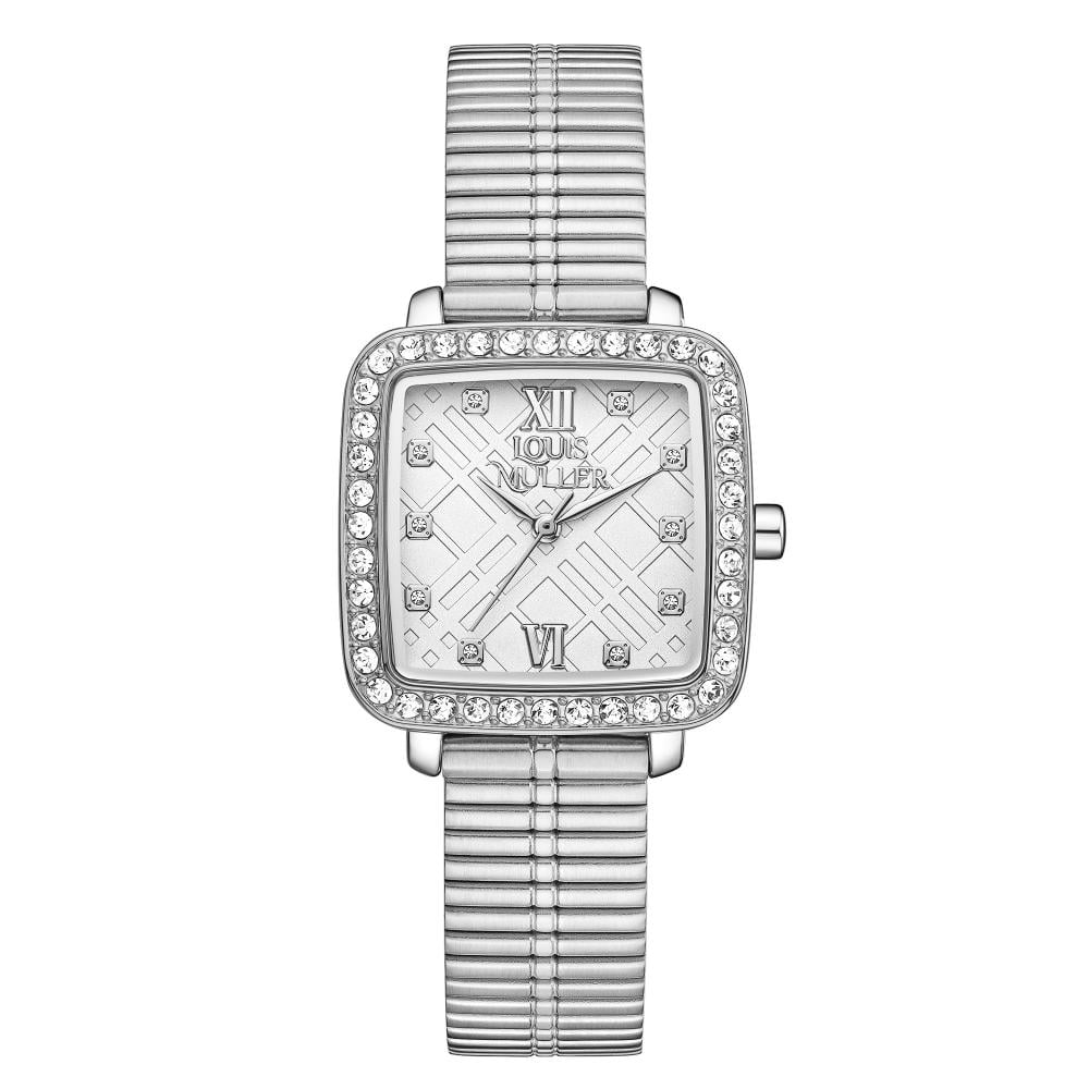 تأتي هذه الساعة بسوار فضي معدني بتصميم مضلع أنيق، مع إطار مستطيل مرصع بفصوص الزركون الشفافة التي تضيف بريقًا راقيًا. الميناء يتميز بنقوش هندسية فاخرة، ويعرض رموزًا رومانية عند الساعات 12، 3، 6، و9، مما يمنح الساعة طابعًا كلاسيكيًا مميزًا. توقيع Louis Muller يزين الميناء ليؤكد على جودة التصميم. إنها ساعة فاخرة تنافس ساعات زايروس والدهام، وتُعد خيارًا مثاليًا لهدايا المناسبات الراقية.