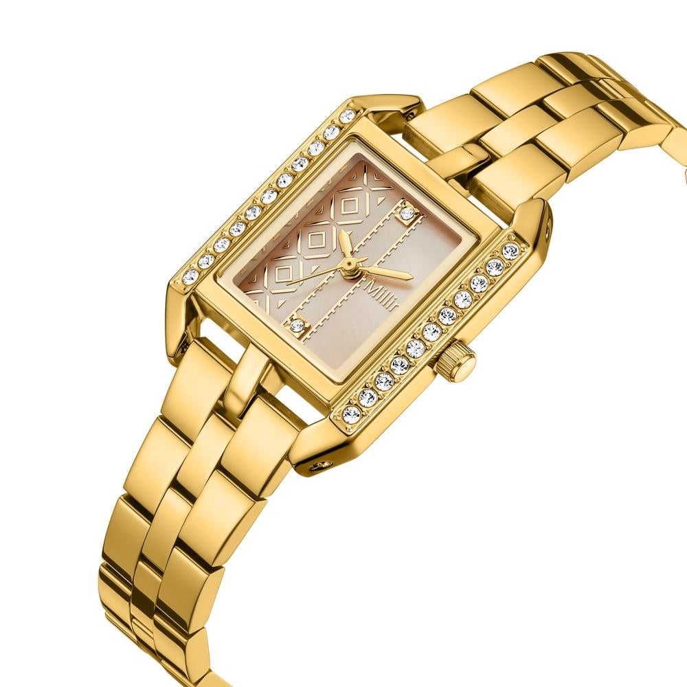 تألقي بإطلالة ملكية مع هذه الساعة النسائية التي تتميز بإطار مستطيل ذهبي مرصع بفصوص زركون وكريستال تضفي لمسة من الأنوثة الراقية. الميناء مزخرف بنقوش هندسية ناعمة، بدون أرقام، مما يمنحها طابعًا عصريًا أنيقًا، وتكتمل بعقارب ذهبية دقيقة. السوار المعدني الذهبي المصقول يضيف لمسة من الصلابة والجاذبية، لتكون خيارًا مثاليًا لمحبات الساعات الفاخرة والساعات الذهبية ذات التصميم الفني.