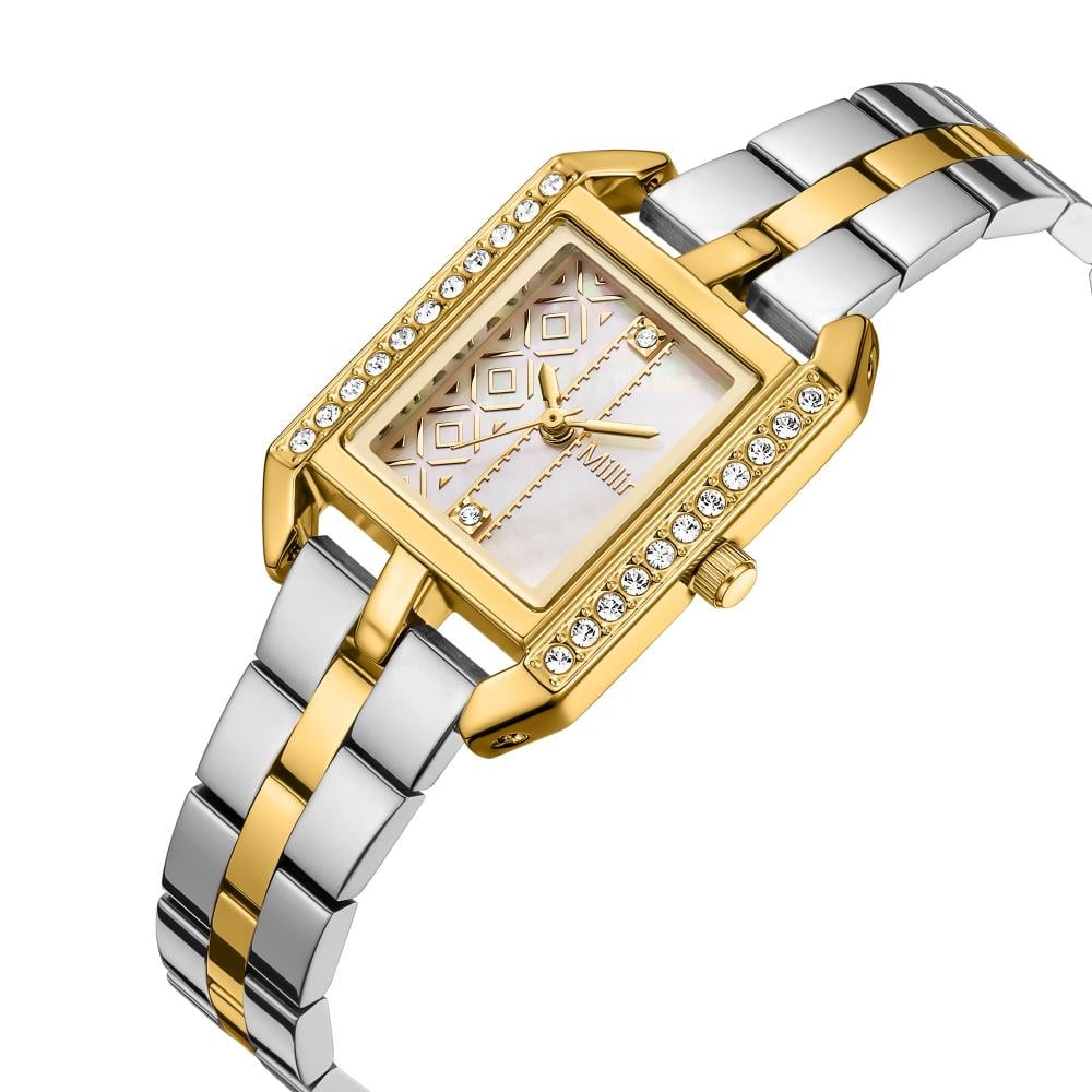 تألقي بإطلالة راقية مع هذه الساعة النسائية التي تتميز بإطار ذهبي مرصع بفصوص زركون وكريستال على الجانبين، يحيط بميناء مزخرف بنقوش هندسية أنيقة. السوار المعدني يجمع بين اللونين الذهبي والفضي ليمنحك مظهرًا متوازنًا بين التميز والعملية، مما يجعلها خيارًا مثاليًا لمحبات الساعات الثنائية اللون والساعات المستطيلة ذات الطابع الفني.