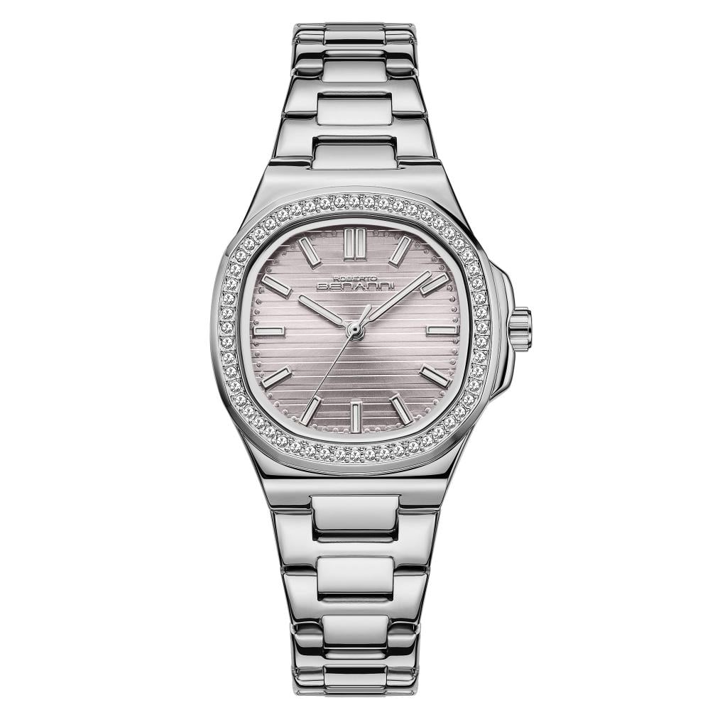 - الميناء: وردي فاتح بنقشة خطوط أفقية، مزين بمؤشرات فضية أنيقة وشعار BENANNI في الأعلى.