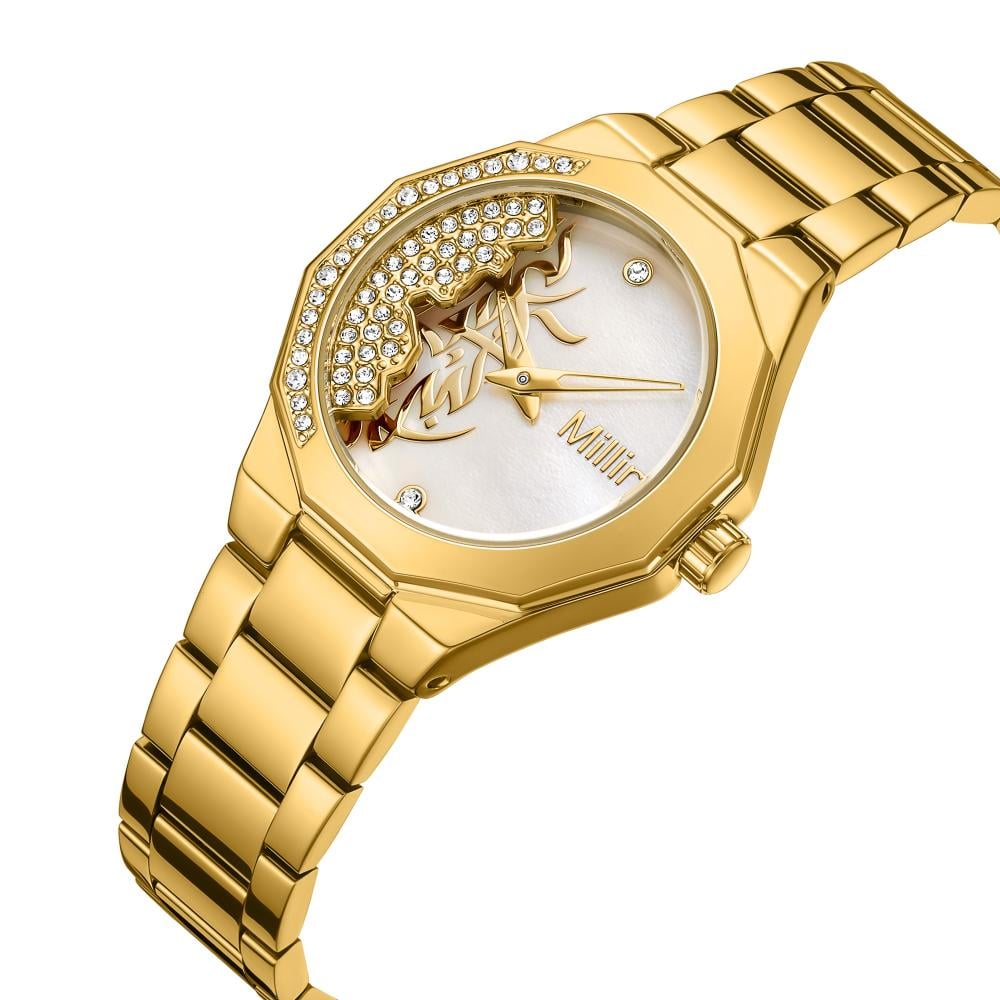 تألقي مع ساعة تجمع بين الفخامة العصرية والرمزية الشرقية، حيث يلتقي التصميم الفني بالمعنى العميق. صُممت لتكون أكثر من مجرد ساعة، بل قطعة مجوهرات تعبّر عن الذوق والهوية.