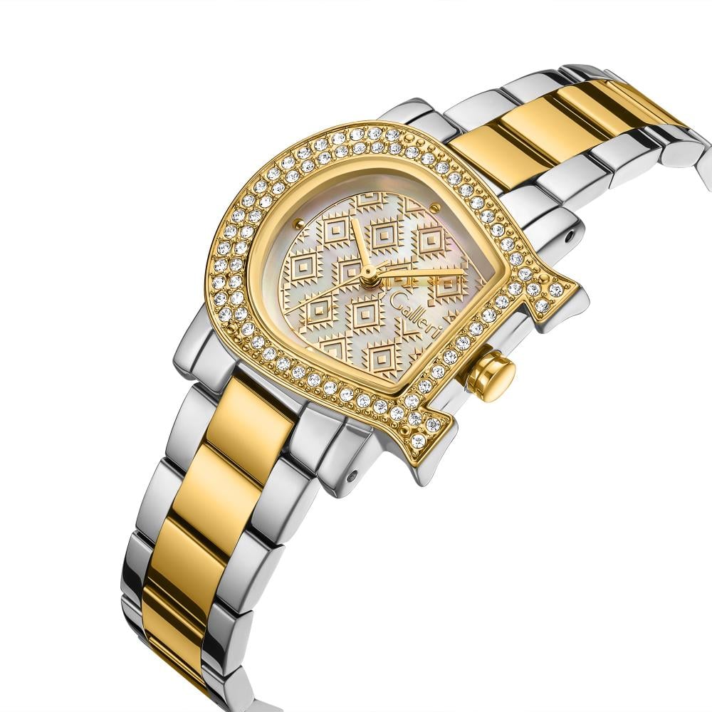 تأتي هذه الساعة بتصميم يجمع بين الأناقة الكلاسيكية واللمسة العصرية، حيث يتداخل اللون الذهبي مع الفضي في سوار معدني مصنوع من الستيل المقاوم للصدأ. يتميز الميناء بنقشات هندسية ذهبية تضيف بعدًا فنيًا راقيًا، ويحيط به إطار ذهبي مرصع بفصوص الزركون اللامعة التي تمنح الساعة بريقًا ملكيًا. إنها ساعة مثالية لكل من تبحث عن قطعة تجمع بين الجمال والدقة.
