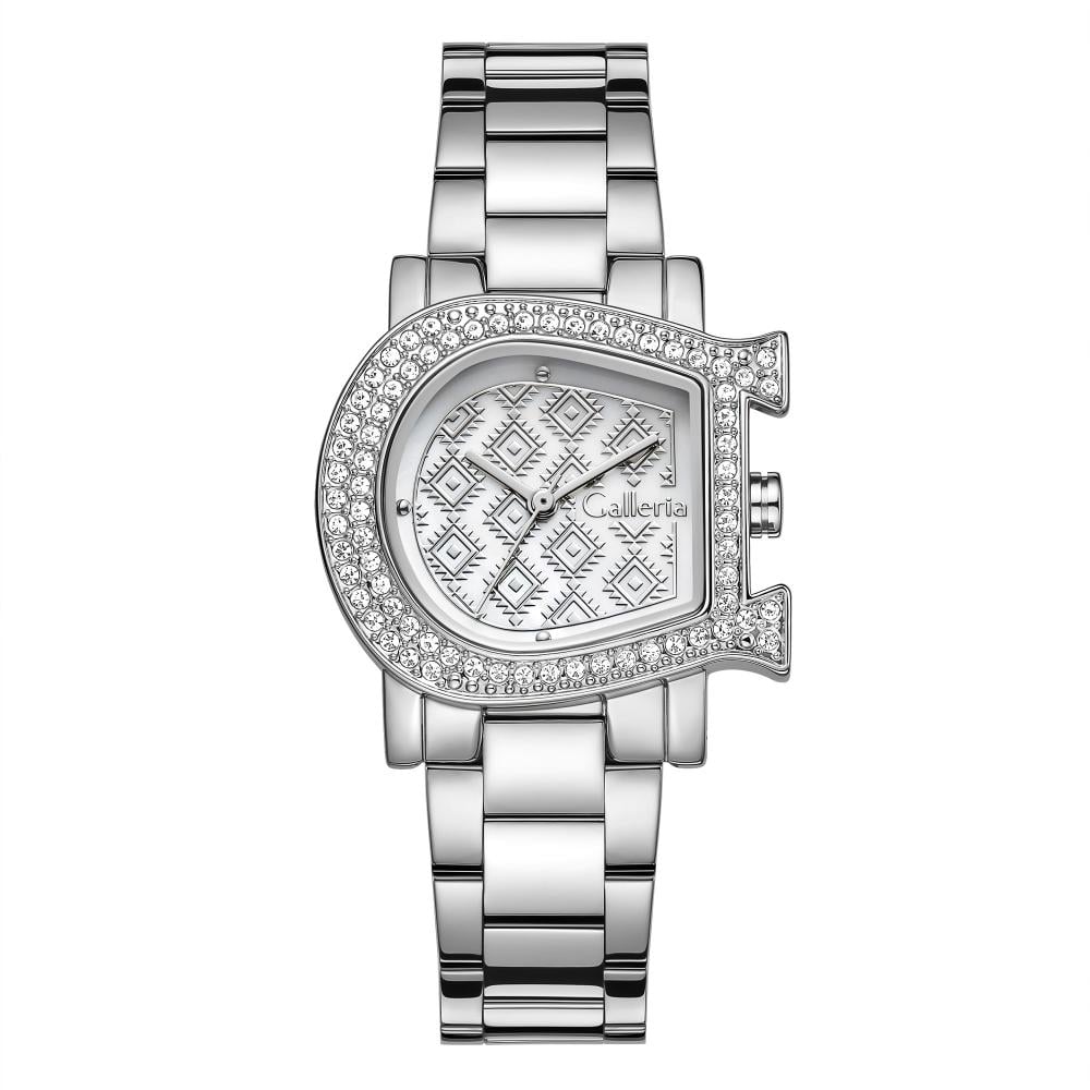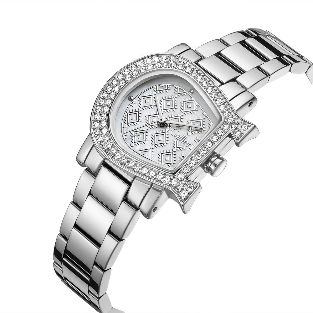 تأتي هذه الساعة بتصميم مبتكر يجمع بين الأناقة والتميز، مرصعة بفصوص زركون وكريستال تضفي بريقًا فاخرًا. الميناء مزخرف بنقشة فنية ناعمة، ويكتمل التصميم بسوار معدني فضي مصقول بعناية ليمنحك إطلالة راقية. إنها ساعة مثالية لعاشقات التصاميم الكلاسيكية ذات الطابع الفريد.