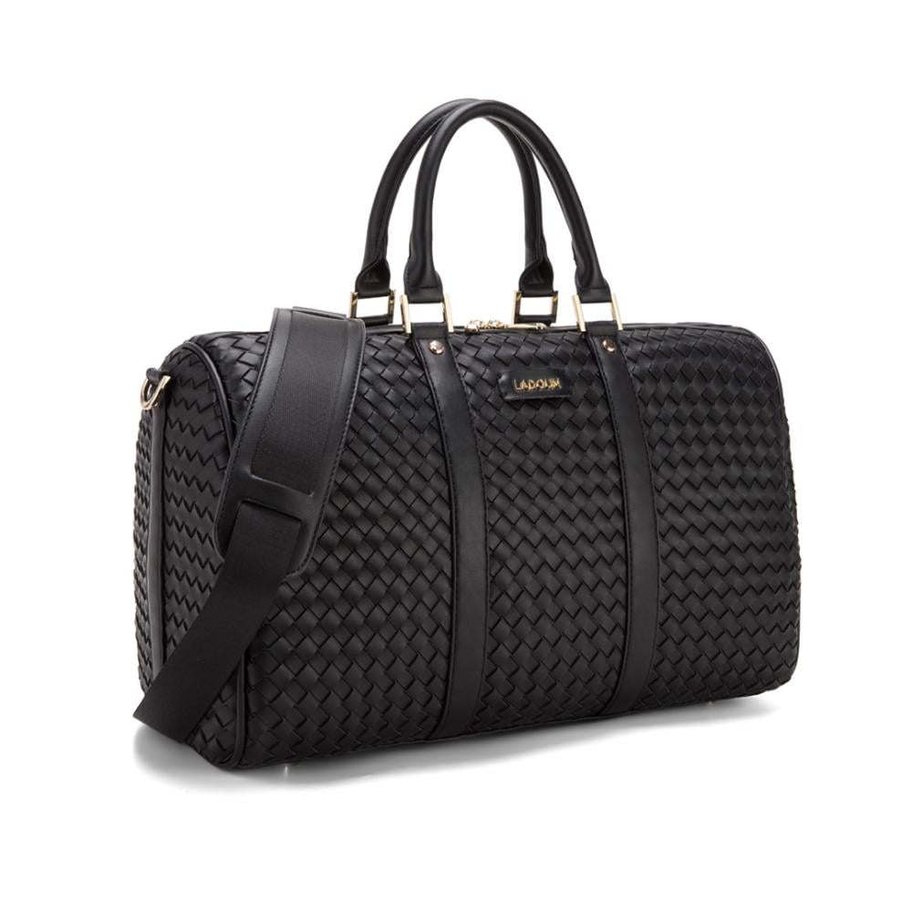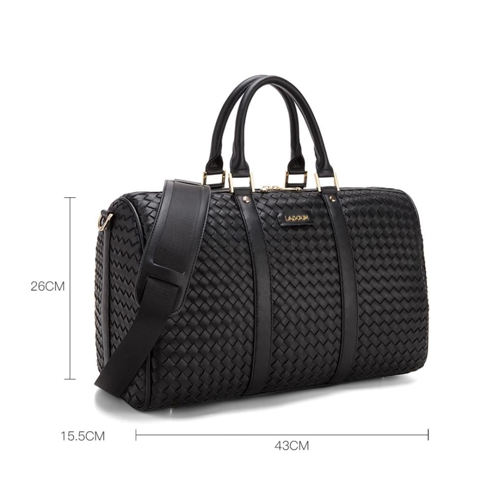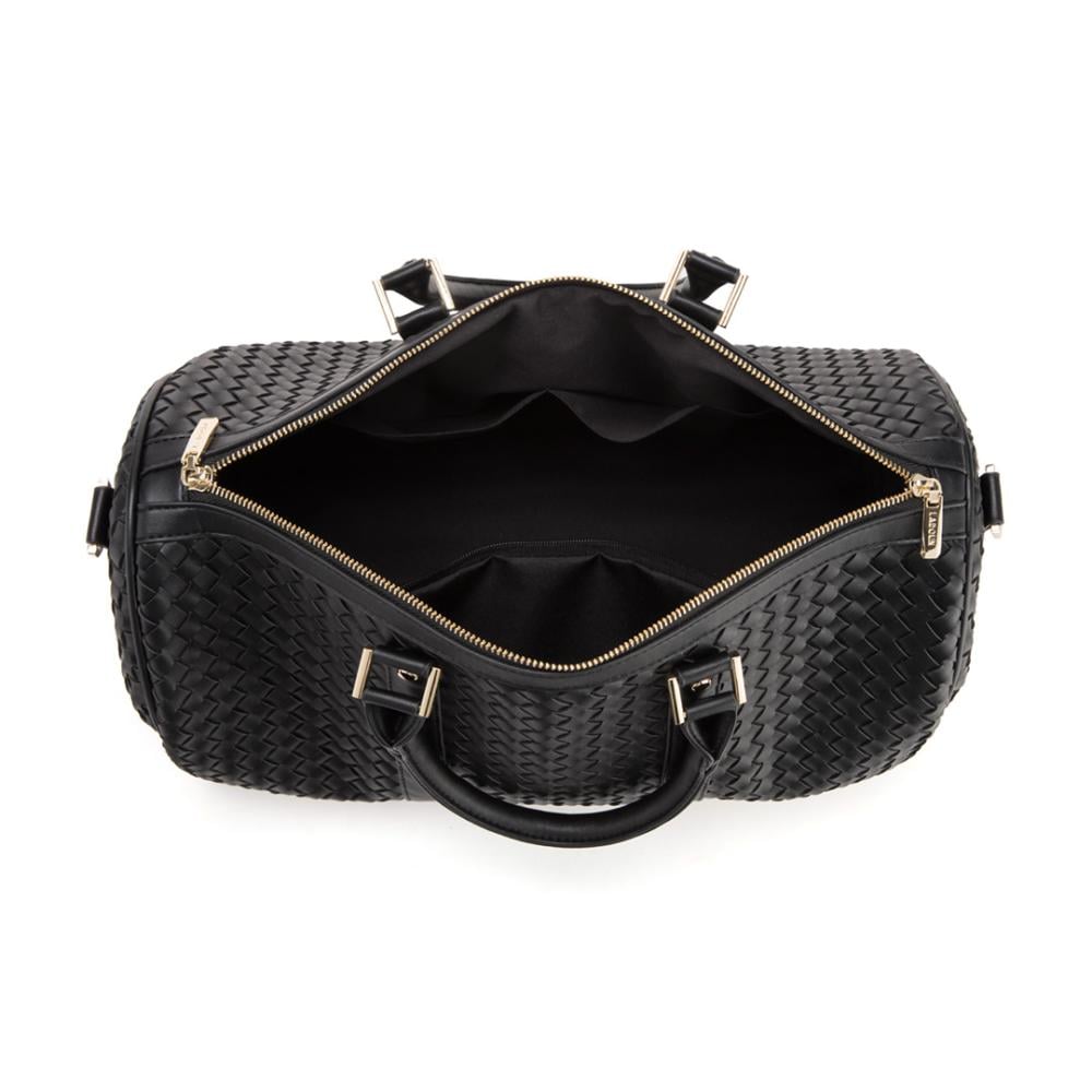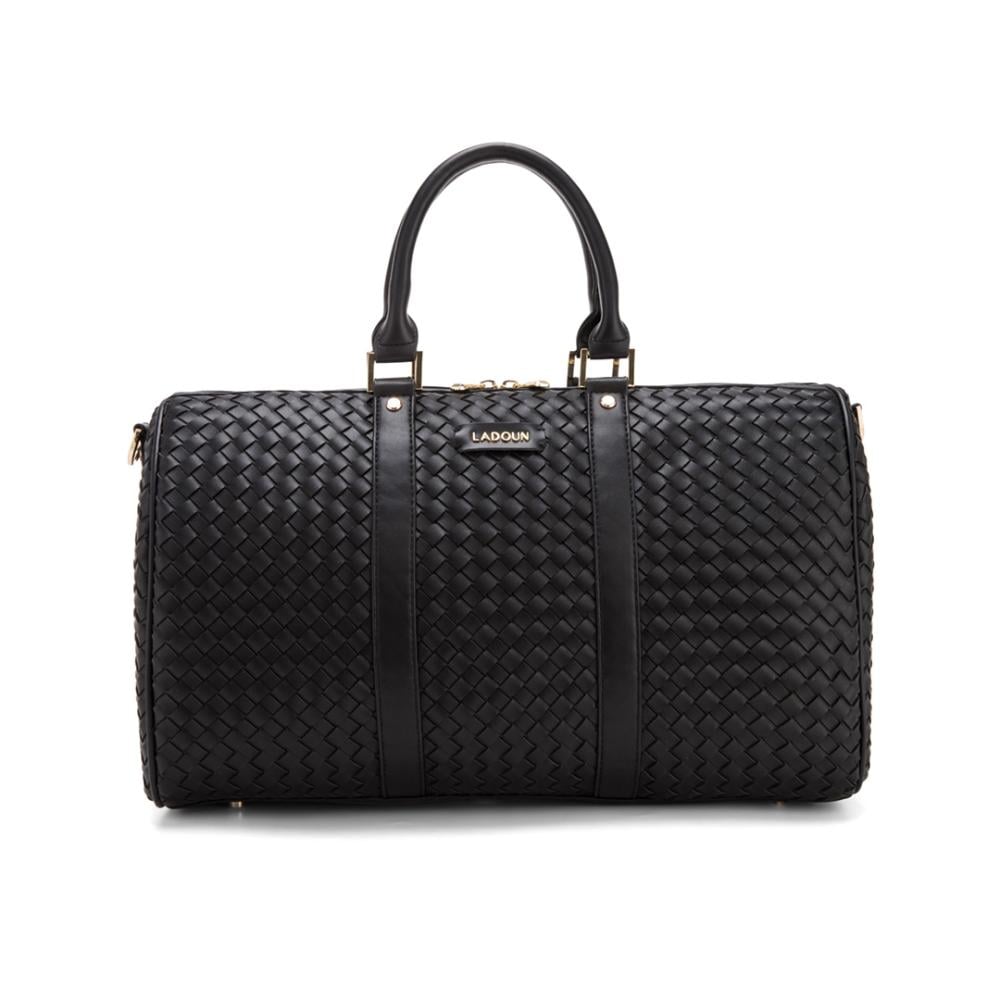 حقيبة يد كبيرة مصممة بشكل عصري وأنيق باللون الاسود. الحقيبة تتميز بنمط متشابك يمنحها مظهراً فاخراً ومميزاً. وهي مزودة بمقابض يدوية متينة وحزام كتف طويل قابل للتعديل، مما يجعلها مريحة للحمل بطرق متعددة.