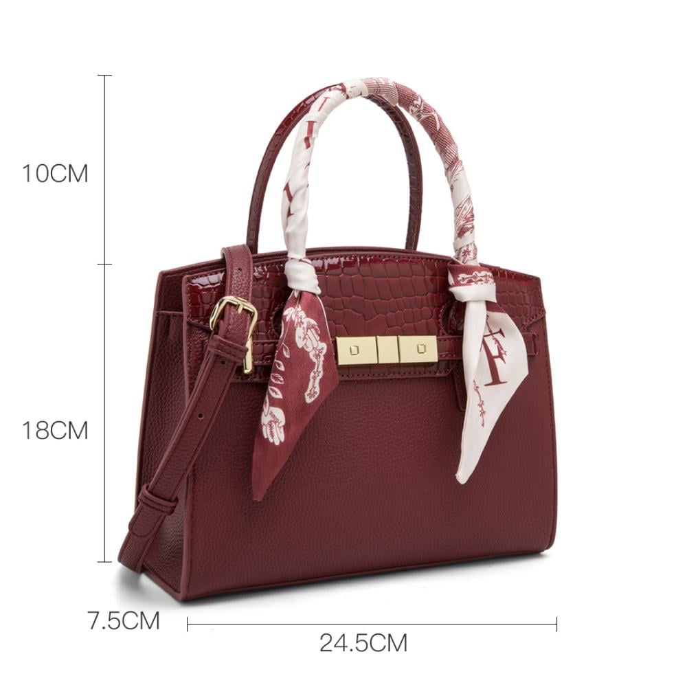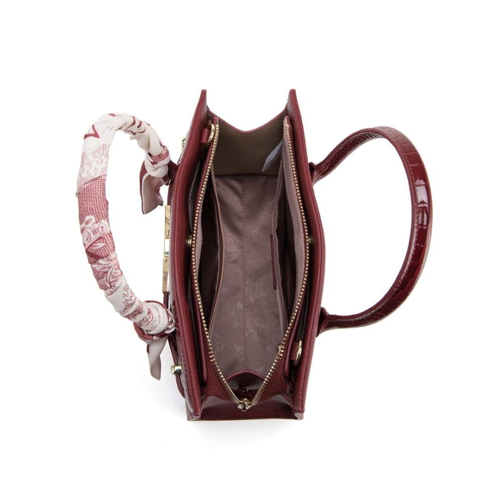 - الخامة: جلد نباتي فاخر مع لمسة منقوشة بتصميم جلد التمساح في الجزء العلوي من الحقيبة، مما يضفي عليها طابعاً فاخراً.
