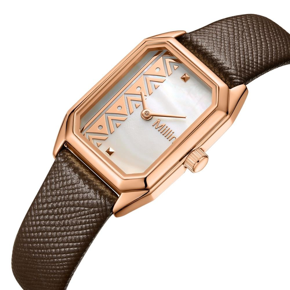 تألقي بإطلالة ناعمة مع هذه الساعة النسائية التي تجمع بين الإطار الوردي الذهبي والميناء اللؤلؤي المزخرف بنقوش هندسية على الجانب الأيسر، مع مؤشرين على شكل مثلثات صغيرة عند الساعة 12 و6. السوار المصنوع من الجلد البني الفاخر يضفي لمسة من الدفء والأناقة، مما يجعلها خيارًا مثاليًا لعاشقات الساعات الجلدية والساعات المستطيلة ذات الطابع الفني.