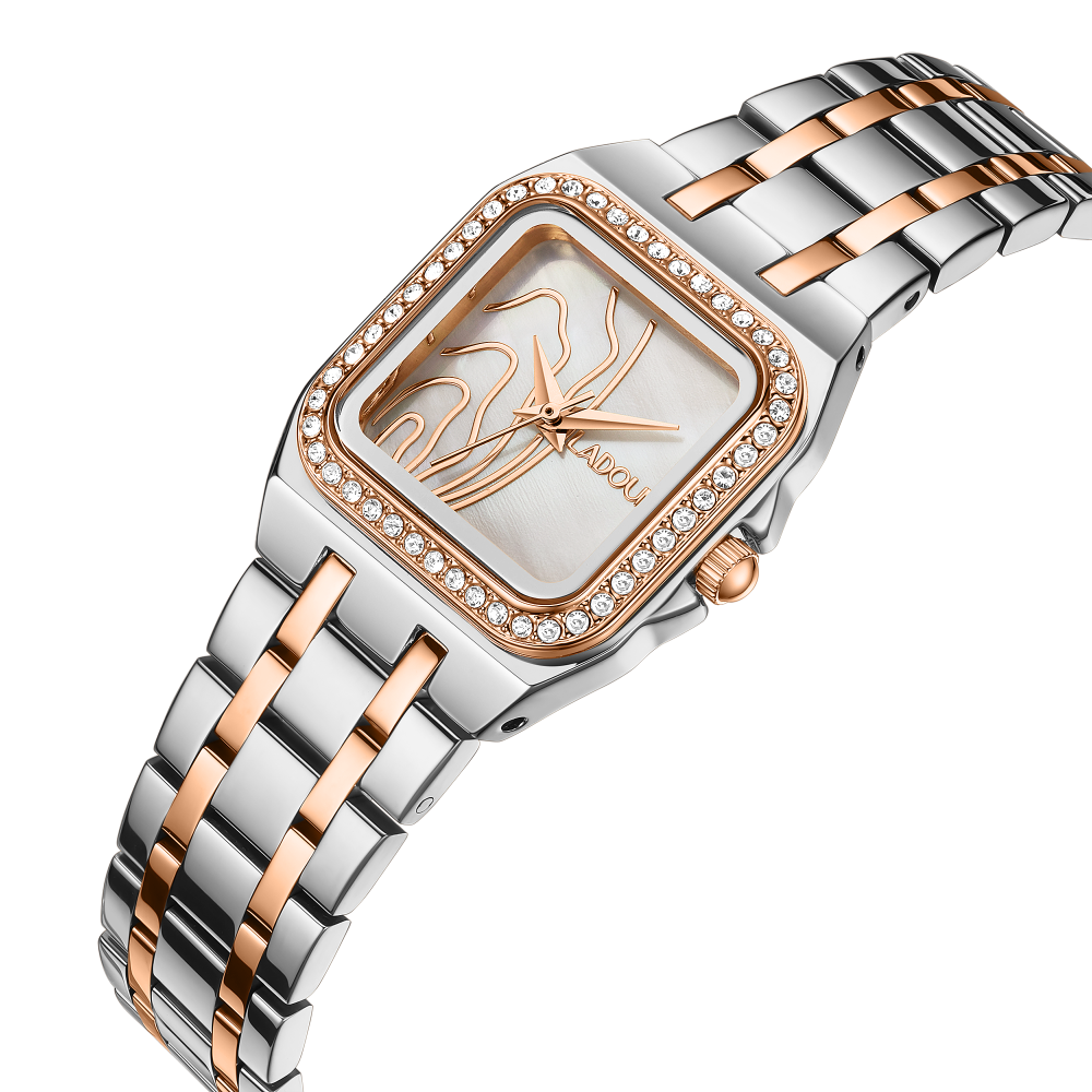 ارتقي بإطلالتك مع ساعة LADOUN النسائية الفاخرة، التي تجمع بين الأناقة والفخامة بتصميمها المميز باللون الذهبي والفضي ،لتكون خيارك المثالي لكل مناسبة.