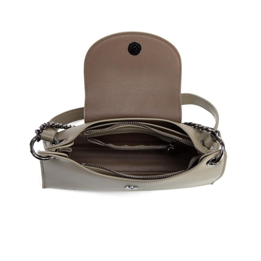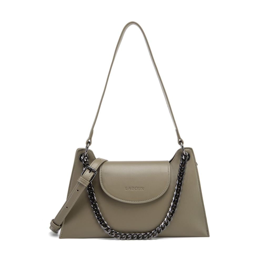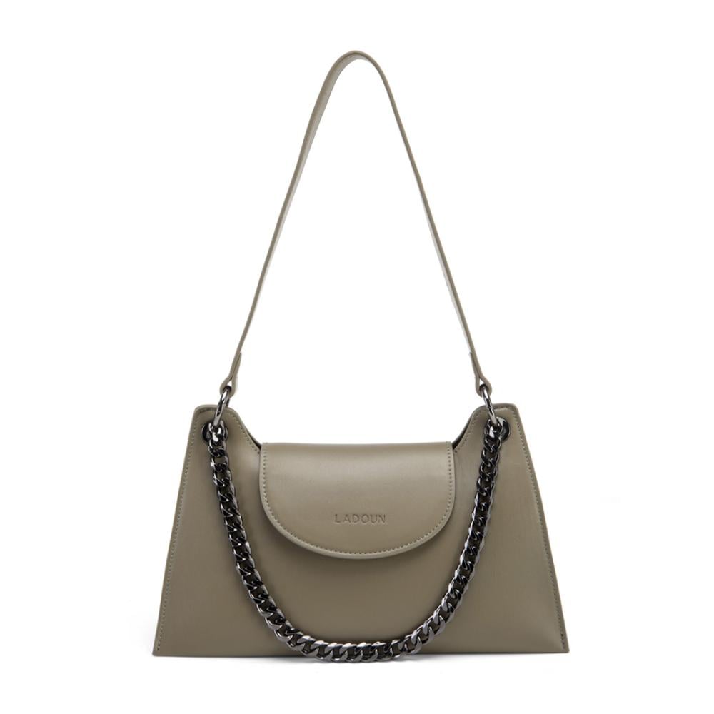 حقيبة يد نسائية من لادون أنيقة بلون زيتوني، مع تصميم عصري ومميز. الحقيبة مزودة بسلسلة معدنية داكنة على الحافة الأمامية التي تضيف لمسة من الفخامة على التصميم.