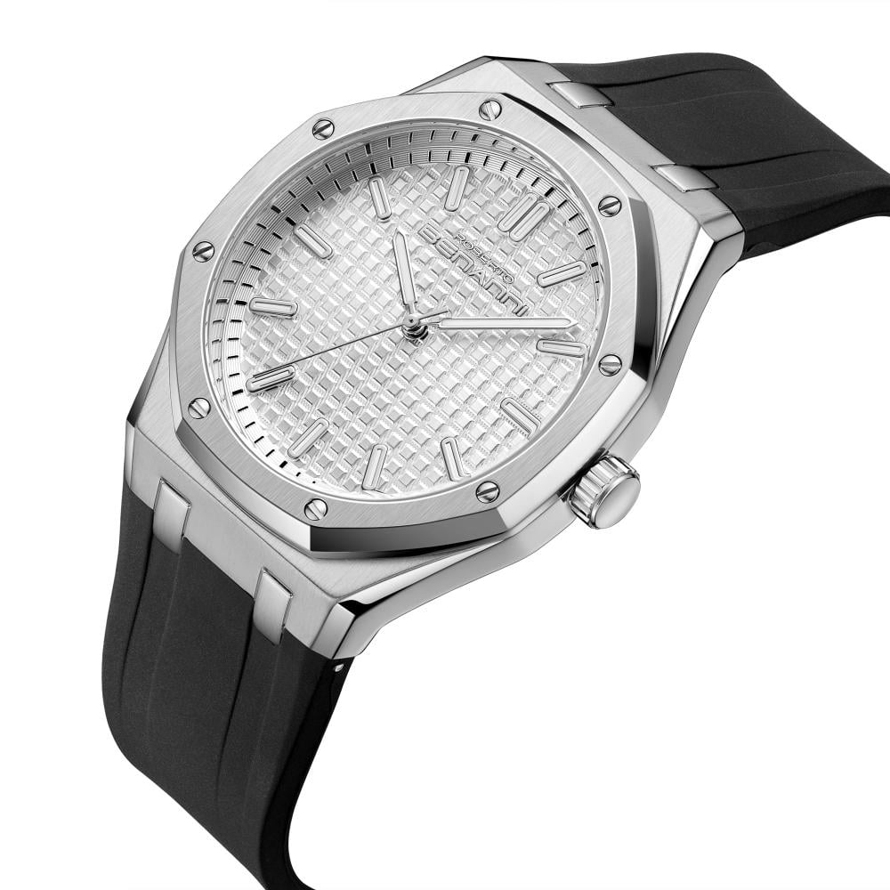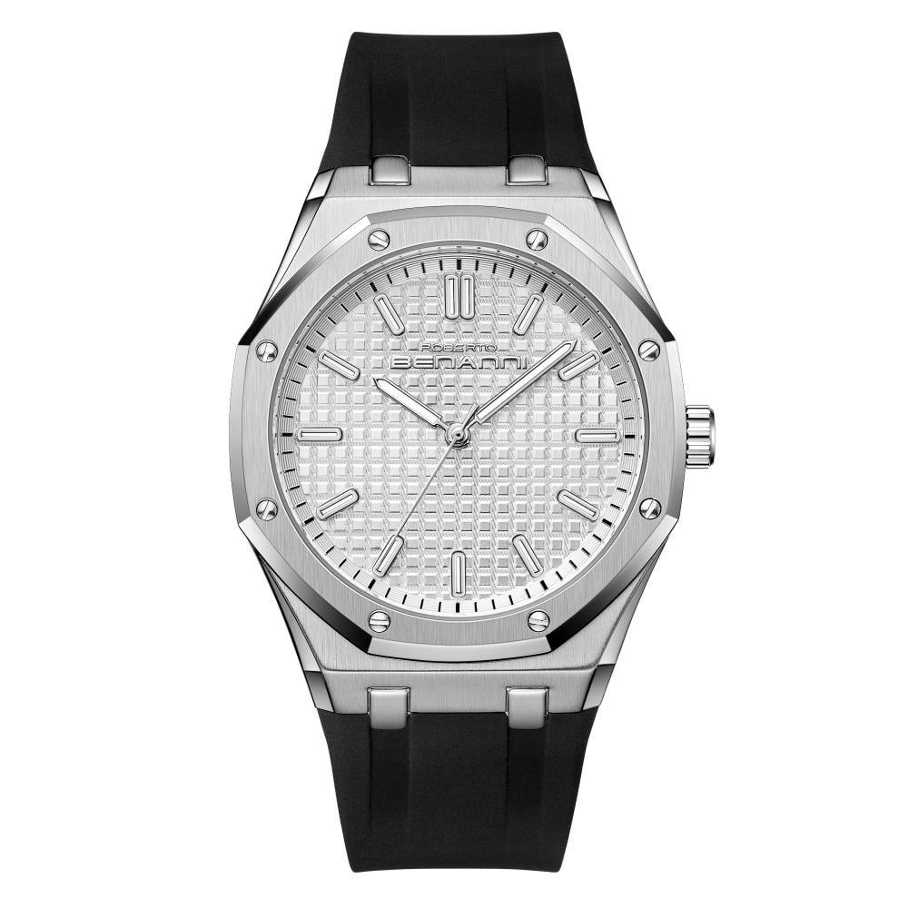 اختَر ساعة بتصميم يجمع بين الجرأة والبساطة، حيث يأتي هذا الإصدار من Reberto Benanni بهيكل ستيل فضي مثبت بمسامير عند الزوايا، وميناء بنقشة فنية أنيقة بدون أرقام، مع مؤشرات فضية واضحة وسوار أسود فاخر يمنحك إطلالة متوازنة بين القوة والرقي. إنها ساعة مثالية لعشاق الساعات الرجالية الفاخرة، والباحثين عن هدية تجمع بين التصميم العصري والمتانة.