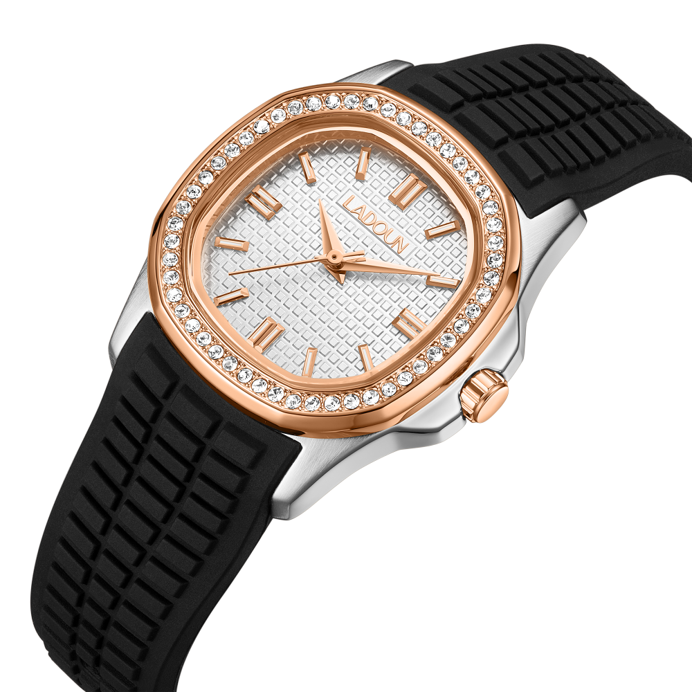 تألقي مع هذه الساعة الفاخرة من لادون، بتصميم يجمع بين الأناقة العصرية والفخامة. تتميز بسوار ربل أسود أنيق، مع ميناء فضي مزخرف يضفي لمسة راقية. الإطار مزين بأحجار براقة ليعكس أسلوباً فريداً يليق بذوقك الرفيع.