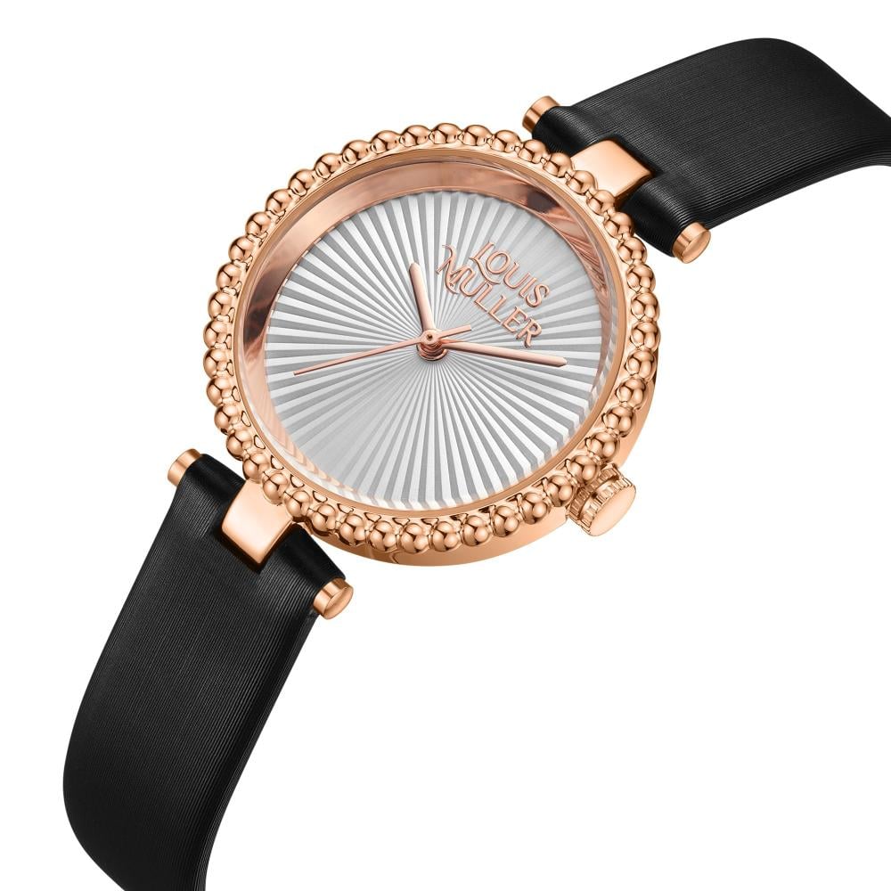 🔹 الميناء: فضي بنقشة شعاعية، مع عقارب وردية ذهبية أنيقة