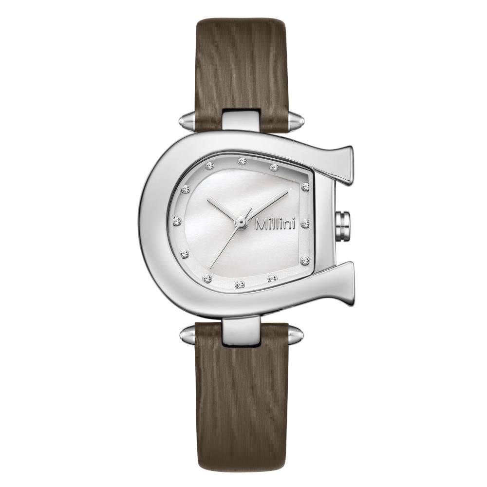 ساعة نسائية فاخرة بتصميم أنيق وجذاب، تجمع بين الفخامة والعملية. ساعة نسائية فاخرة من Milini تتميز بتصميم حدوة فضية وسير جلد بني فاخر، مما يجعلها الخيار المثالي لكل امرأة تبحث عن الأناقة والتميز.