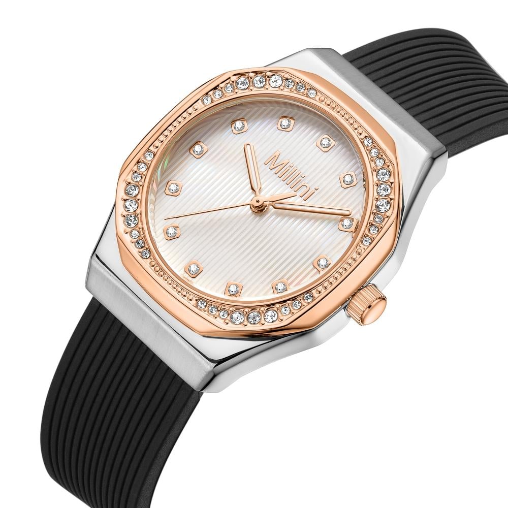 تألقي بإطلالة مميزة مع هذه الساعة النسائية التي تتميز بإطار بلونين فضي ووردي ذهبي يحيط بميناء أبيض أنيق مزين بمؤشرات من فصوص زركون وكريستال عند كل ساعة. العقارب بلون وردي ذهبي تضيف لمسة ناعمة، بينما السوار الأسود يمنحك إحساسًا بالثبات والراحة. إنها ساعة مثالية لعاشقات الساعات الثنائية اللون والساعات الجلدية الفاخرة ذات الطابع العصري.