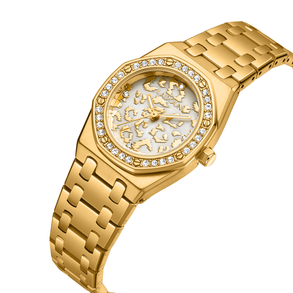 ساعة نسائية فاخرة من LADOUN – تصميم دائري بلون ذهبي