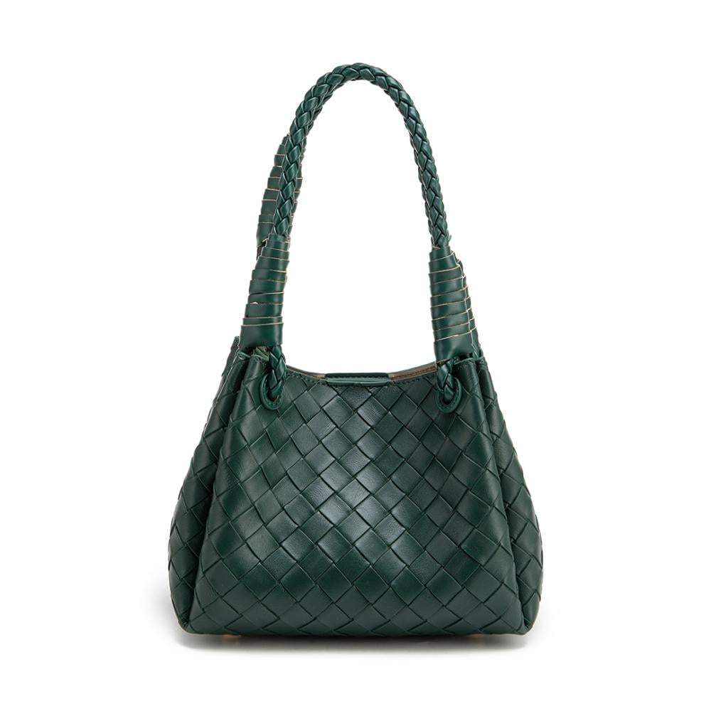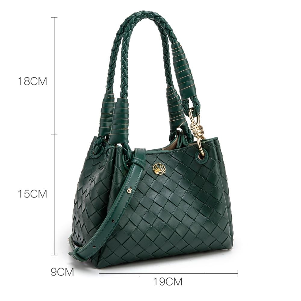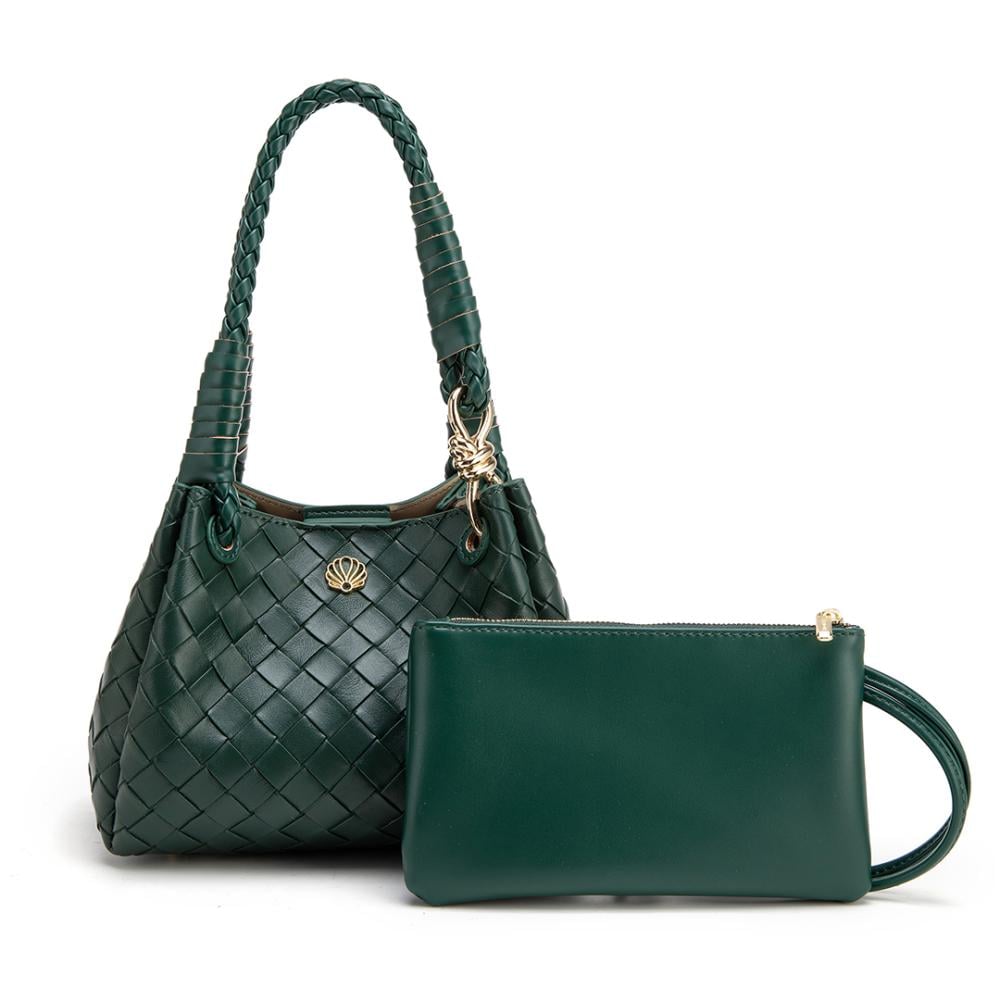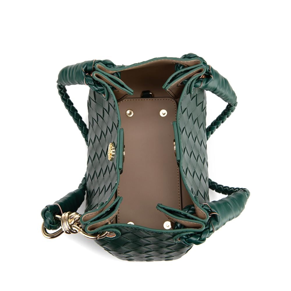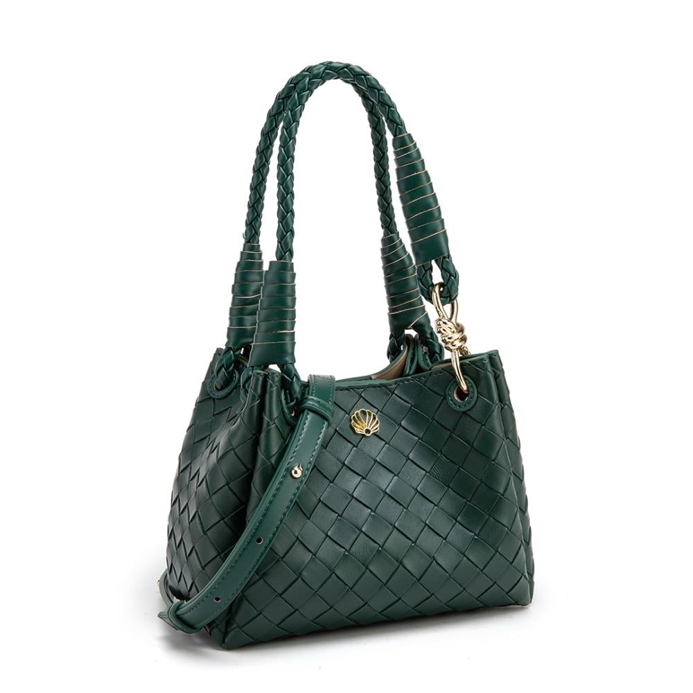 حقيبة يد نسائية من لادون أنيقة باللون الزيتي، تتميز بتصميم متشابك يضفي عليها لمسة من الفخامة والتميز. الحقيبة مزودة بمقبضين يدويين بالإضافة إلى حزام كتف قابل للتعديل، مما يجعلها متعددة الاستخدامات وسهلة الحمل بعدة طرق.